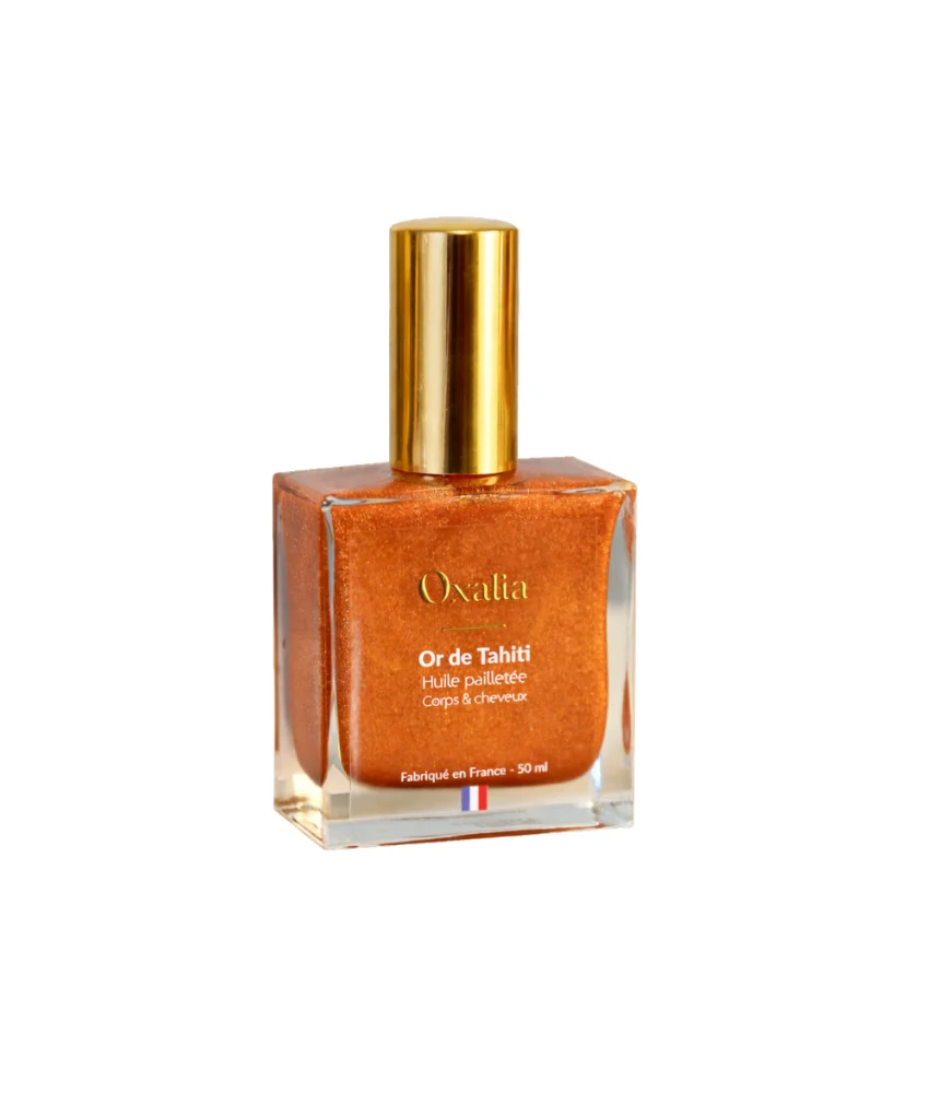 Cette huile pailletée 100% naturelle, au doux parfum de tiaré, sublime le corps d’un éclat cuivré tout en nourrissant intensément la peau.
