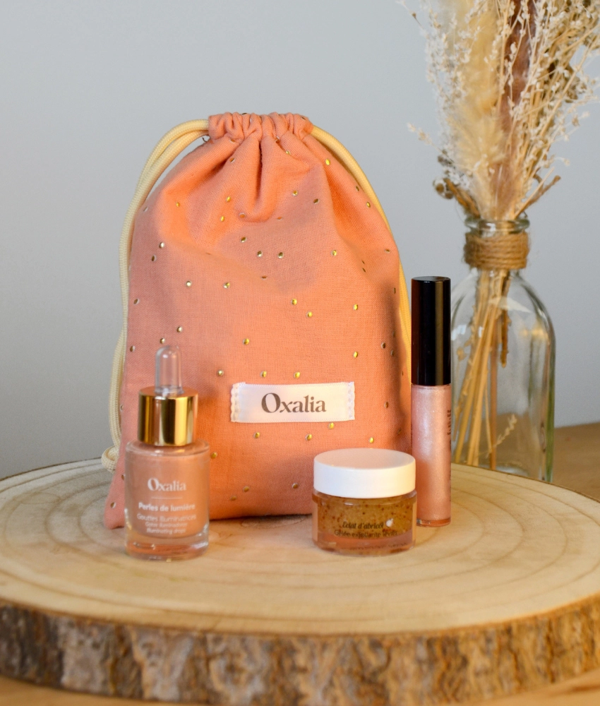 Trio Lèvres & Paillettes l’alliance du glow et du soin. Gelée exfoliante pour lisser, gouttes illuminatrices pour capter la lumière, et huile lèvres au choix pour nourrir et sublimer d’un fini brillant.